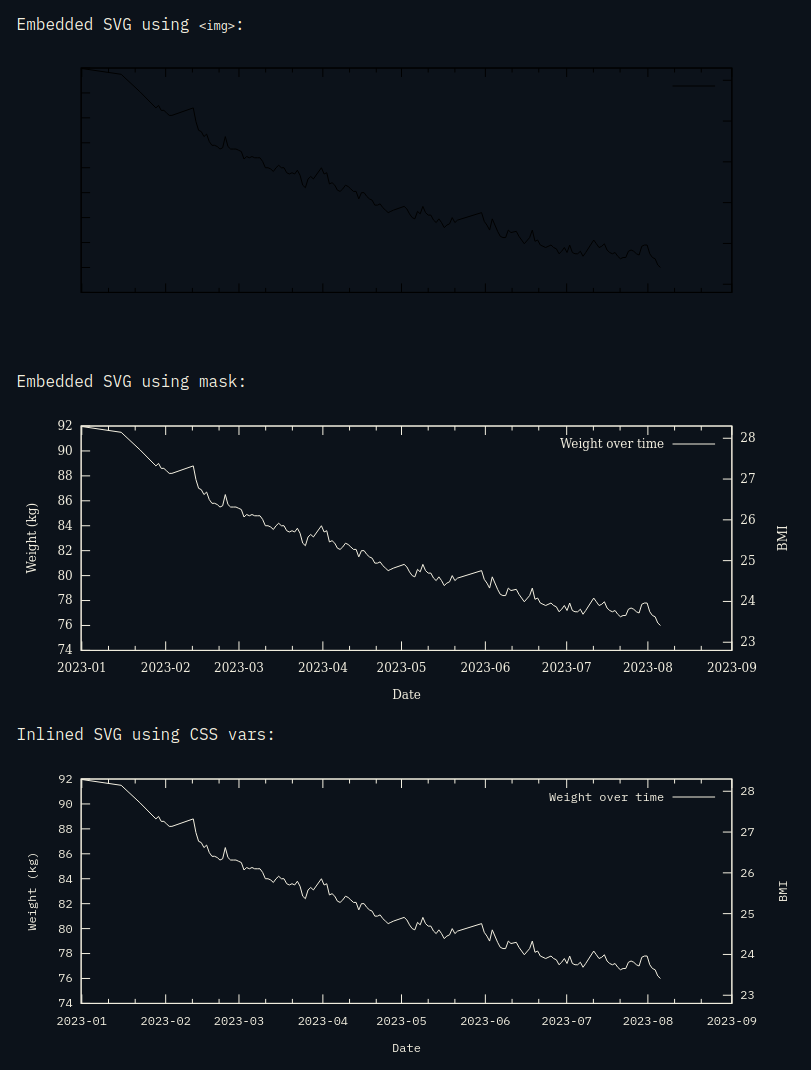 Generating SVGs is a bit of a pain because they're not widely supported, but there are still many tools that do. I found gnuplot to be a great tool for generating these. That said, the SVGs it creates will have colours that are well-defined so that the SVG can be used as-is. If we want it to be dynamic (to some degree), then this will need to change.